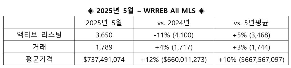 WRREB는 2025년 첫 5개월간 전체 MLA 거래는 6,094건으로 전년도 동기간과 비교하여 7 퍼센트 증가했고, 전체 액티브 리스팅 숫자는 9,945건으로 1 퍼센트 감소 그리고 거래액은 14 퍼센트 상승한 2.4 빌리언 달러로 발표했다.