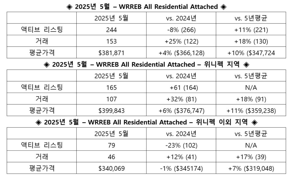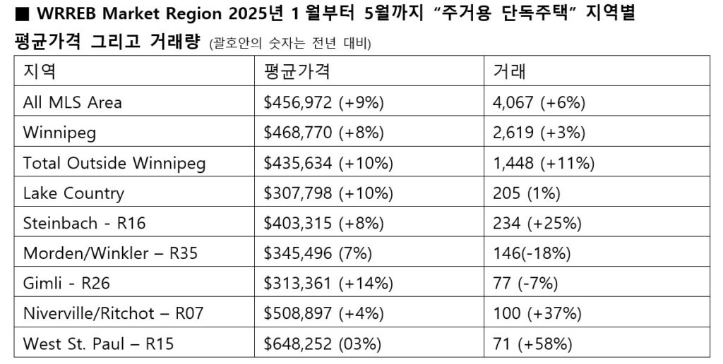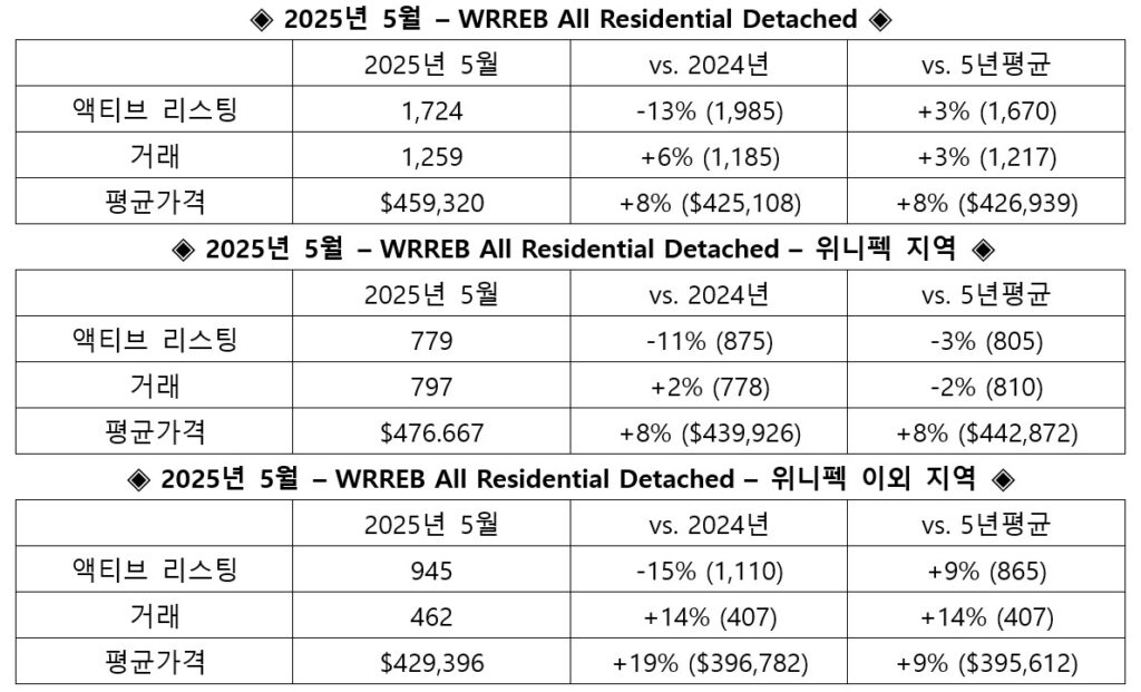 2025년 5월, WRREB의 단독주택은 2024년 동월 그리고 5년간 평균과 비교하여 매매량, 거래액 그리고 평균가격에서 상승한 것으로 나타났다.