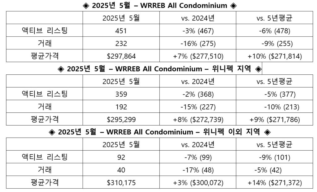 콘도미니엄은 2025년 5월에 MLS를 기준으로 매매량과 거래액은 감소했지만, 2024년 5월과 5년간 평균에 비해 가격은 높아진 것으로 나타났다.